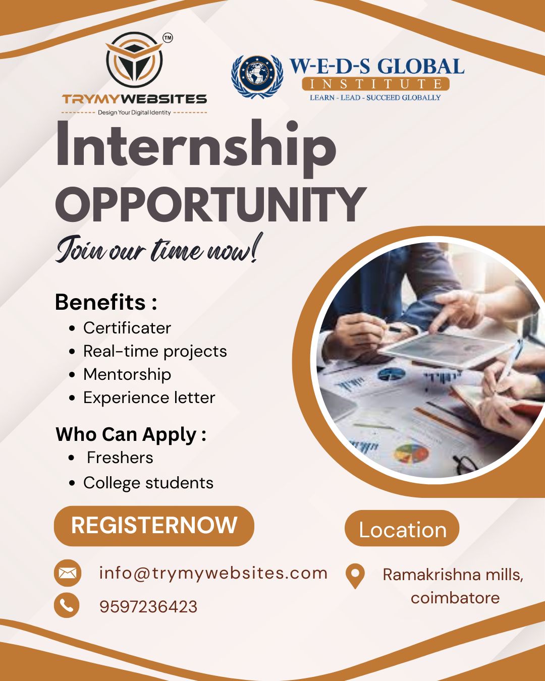 Stay connected with TRYMYWEBSITES™ and WEDS Global Institute through our social media platforms. Discover inspiring student success stories, hands-on training sessions, project highlights, industry workshops, and placement achievements. Our social media showcases the journey of students transforming their skills into real-world careers through innovative learning and professional mentorship.